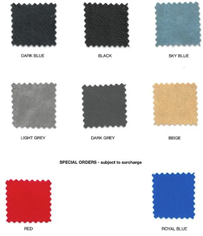 Our standard colours are: Dark Blue, Black, Sky Blue, Light Grey, Dark Grey & Beige with Red and Royal Blue available subject to surcharge. You can also upgrade to a double thickness foam to increase the comfort of your patients where necessary.